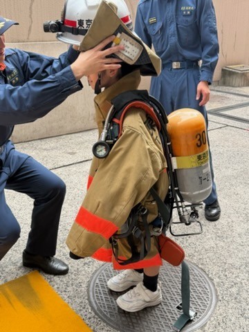施設の見学では、事務仕事をするとこや、食堂、仮眠室なども見せていただきました。消防士の人たちは、勤務の日に交代で夕食を用意していることや、消防士の方がよく食べる「消防うどん」についてもお話を聞きました。仮眠室では、交代で眠るという話を聞くと、「ぐっすり寝られないね。」と消防士の大変さを痛感しているようでした。最後には、消防士の方の出場時の着替えの様子を見せていただき、実際に重さを体験したり、消火器を使った訓練を体験したりしました。命を落とすかもしれないのに、一生懸命工夫しながら仕事をする消防士の方に感動する姿も見られました。大変貴重で、充実した時間になったと思います。
