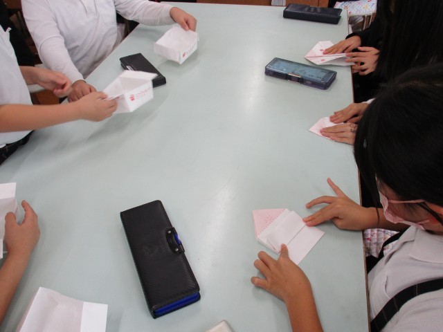 終盤には、片付けでの生ごみの処理について考えて生ごみの80%が水分であることから、生ごみを入れる用のチラシごみ入れを一人一つずつ作成しました。
