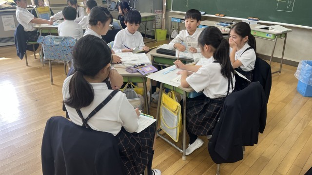 話し合いの目的を「1年生におもしろいと思ってもらえるような本をしょうかいする。」と決め、目的に合うような本を選びました。その後、班ごとに司会や記録、計時など役割を決めて、話し合いを行いました。話し合うときには、本を選んだ理由を項目ごとに整理したり、本の内容が、話し合いの目的に合っているかどうか確認したりしながら、検討していきました。
