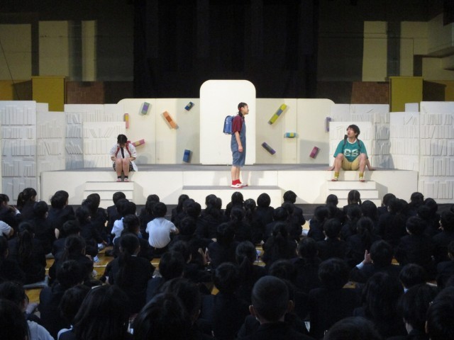 11月25日(火)に、全校児童が劇団風の子による「ちぇんじ 図書室のすき間から」を鑑賞しました。