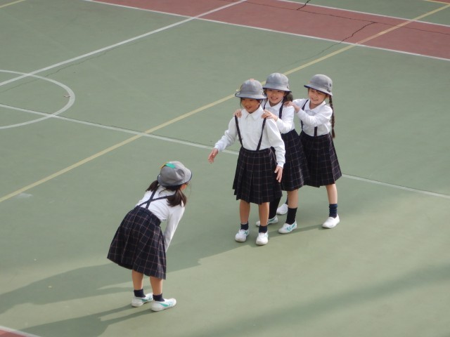「ことろことろ」は、列になった子とオニが向かい合って、列の一番後ろの子がオニにタッチされないように逃げる遊びです。