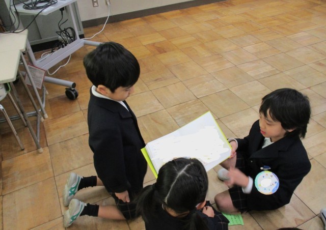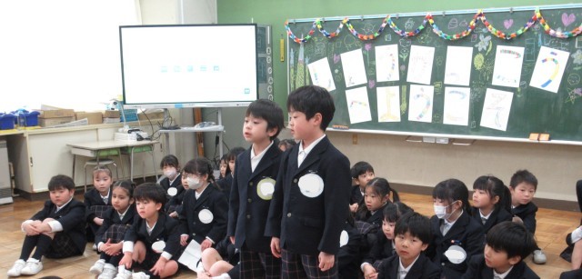これまでの生活科の学習で、年長児に分かりやすく伝えようと一生懸命準備を進め、当日は「ハッピー学校たんけん」」と「1年生なりきりたいけん」の2つの活動に取り組みました。