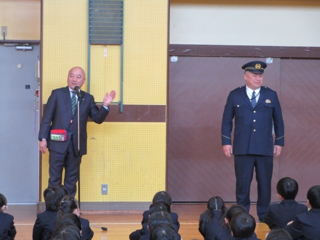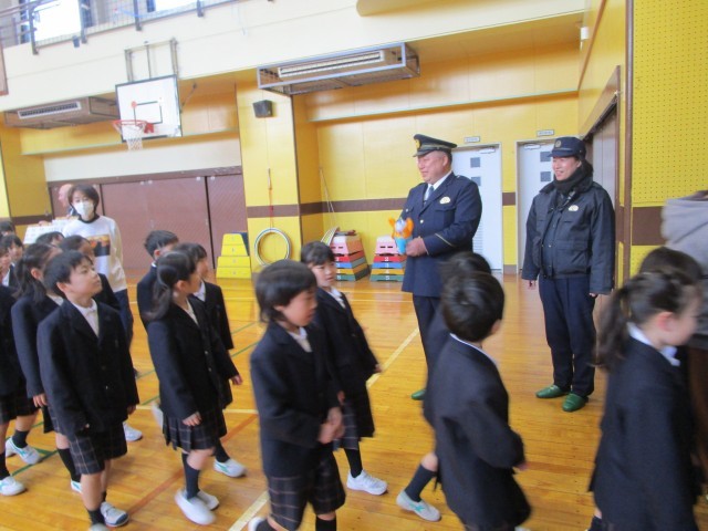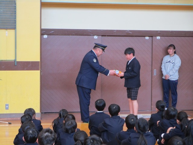 全校朝会で、いつも児童の登下校を見守ってくださる蔵前警察の方から、