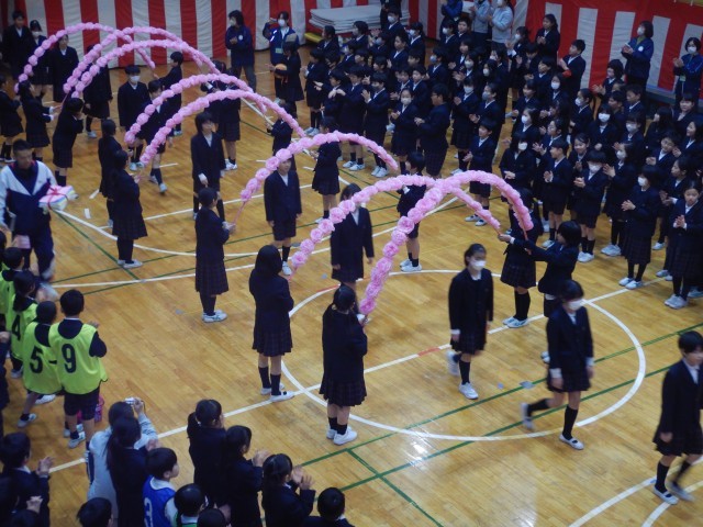 2月25日(水)に、全校児童が体育館に集まり、卒業する6年生をお祝いする、「6年生を送る会」が行われました。