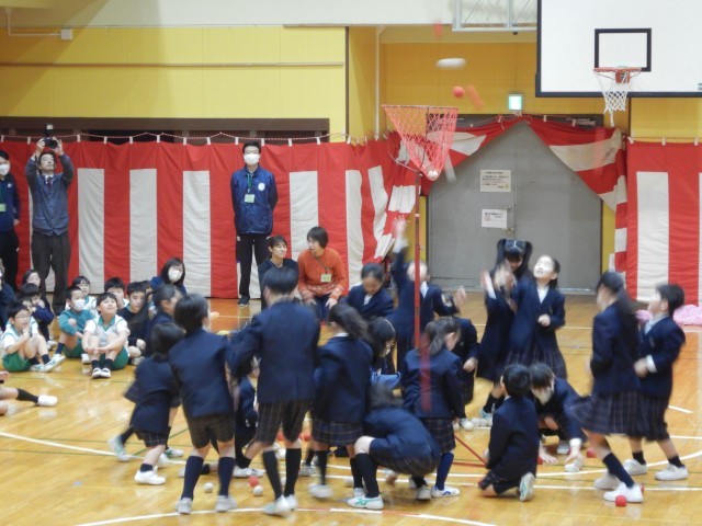 1年生から5年生までの各学年、そしてひまわり学級の児童が、「玉入れ」や「ボーリング」、「フリースロー対決」など、それぞれ考えたゲームを6年生と一緒に行って、楽しいひとときを過ごしました。