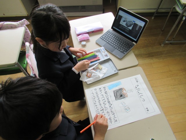 進級して、もうすぐ1ヶ月がたちます。2年生は35人の1クラスとなり、毎日元気に生活しています。生活科の学習では、1年生と学校探検をするための準備真っ最中です。今年は2年生のお兄さんお姉さんとして、1年生をリードして校舎の中を案内します。今週の生活科では、学校の中の部屋の説明カードを完成させました。説明する人やシールを貼る人の担当を決めました。当日に向けて、準備を協力して進めている2年生がとても素敵です。5月11日の当日がとっても楽しみです。