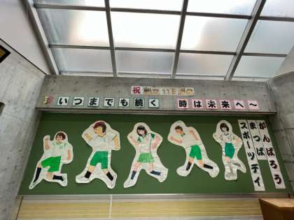 6年生は最高学年として、松葉小の全員を応援するための掲示物を作成しました。まつばスポーツデイ当日に向けて練習に励んでいる小学生の姿です。8月に実施した日光林間学園の時の班で、一体ずつ描きました。とても大きな掲示物です。児童用靴箱の傍の壁面に掲示しています。ご来校の際にぜひご覧ください。