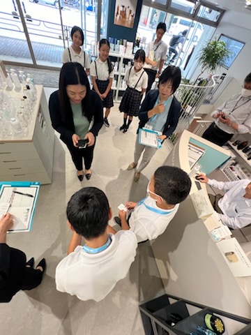 「竹本容器様」では、お客様(相手も事業者)が求める容器の形や用量等のニーズについてどのように聞き取りをするとよいか学びました。その後、名刺交換等接客の仕方を体験させていただきました。