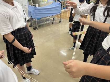後半は、「松風ごま」という遊びを教えてもらいました。こまを回すと、マツの葉が風に吹かれているような音を立てることができるのですが、それがなかなかうまく音が出せず、苦戦している様子も見られました。教えてくださる委員の方の回し方をまねたり、上手に回している友達にコツを聞いたりと、一生懸命こまと向き合っていました。