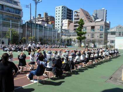 校庭で1年生を迎える会が開かれました。各学年が準備を担当しました。