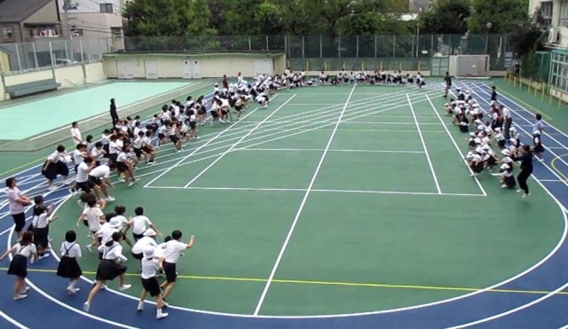 全校でトラックに並び、一斉に「初めの一歩」でトラック内に入りました。