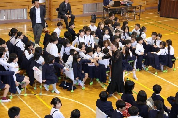 お話の後は、中山晋平先生の歌「シャボン玉」を一緒に歌ったり、さくらまやさんが歌う「お祭りマンボ」「残酷な天使のテーゼ」を聴いたりと、楽しい歌の時間を過ごしました。最後に、一緒に校歌を歌いましたが、さくらまやさんの歌と、子供たちの歌で、体育館が響き渡りました。
