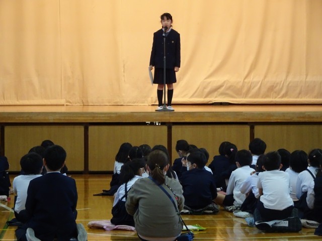 学年から選ばれた代表児童が、ステージに立ってスピーチします。