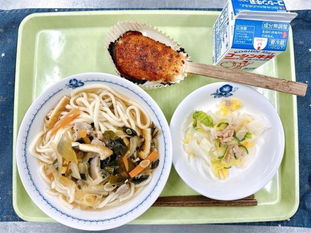 また、今日のうどんに入っているねぎ、サラダに入っている白菜、大根は、なんと中山晋平先生のご親戚である、中山日出夫さんが育てられたものです。