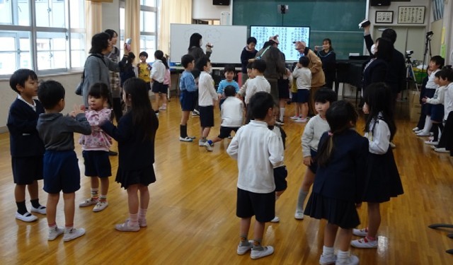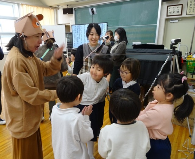 1年生は、中山晋平先生作曲の「証城寺の狸囃子(しょうじょうじのたぬきばやし)」を題材に、幼稚園の4,5歳児、つき組,にじ組の皆さんと音楽を楽しみました。