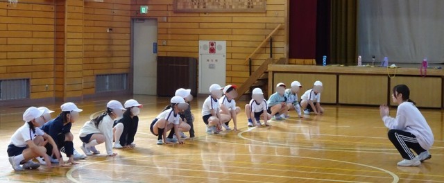 かえる跳びなどで準備運動をした後、踏み越し跳びやまたぎ乗りなどの運動に挑戦しました。