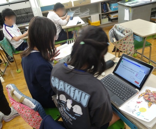 一人で黙々と進める児童、友達と一緒に教え合って進む児童、自分に合った学び方を模索しながら、しっかりと学習を進めています。