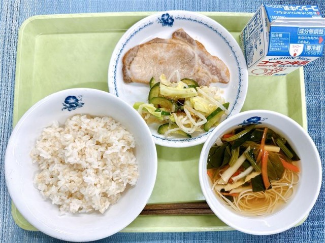 金曜日にもお話をしましたが、豚肉のビタミンB1は疲労回復物質です。また、玄米にも含まれるので、今日は玄米を入れてご飯を炊きました。さらに、和え物に入っている梅干しにはクエン酸が含まれ、これも疲労回復に役立ちます。