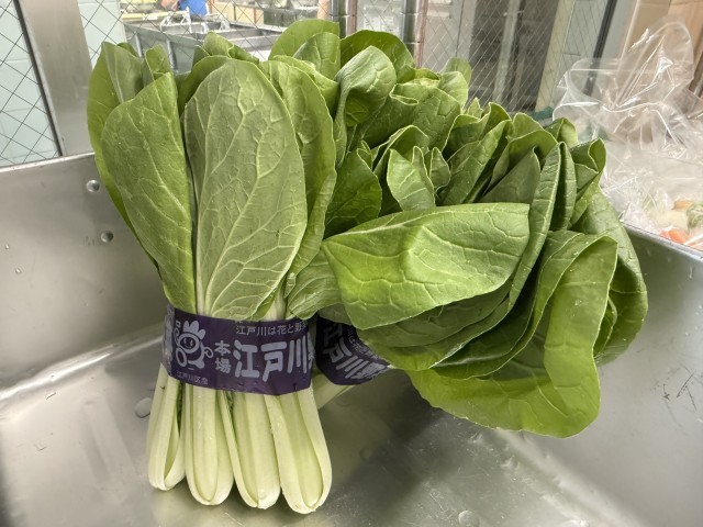 和え物に使っているシントリ菜は、おなじみ江戸川区の農家、生田さんが育てられたものです。今年度、東京都産の食材を使うのはこれで最後ですが、これからも東京都でとれる食べ物について興味・関心をもってもらいたいと思います。