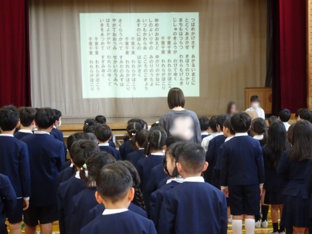 今朝の音楽朝会では、1年生に校歌を披露しました。