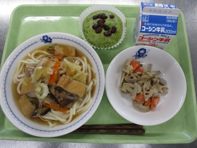 4月8日(水)今日の給食「きつねうどん・根菜(こんさい)のごま和(あ)え・よもぎ豆乳(とうにゅう)蒸(む)しパン・牛乳(ぎゅう」