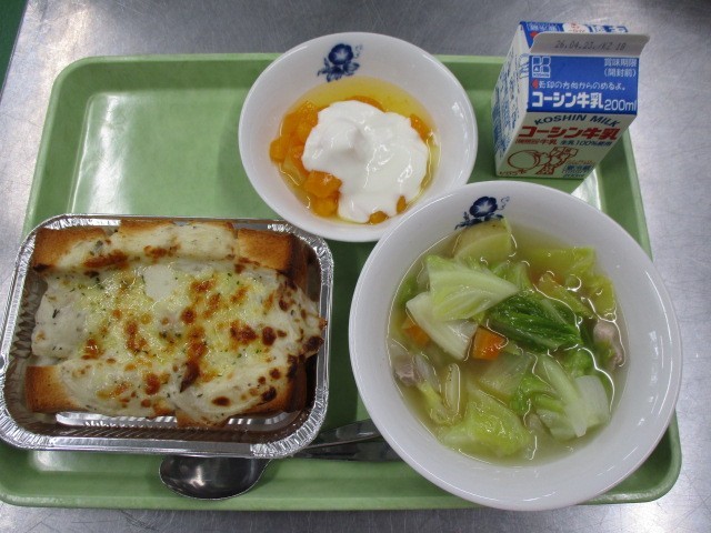 4月14日(火)今日の給食「パングラタン・春野菜のスープ煮・フルーツのヨーグルトかけ・牛乳」