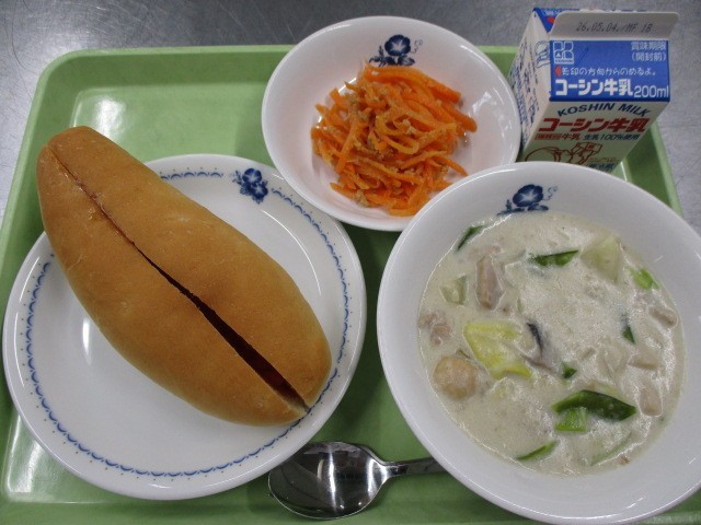 4月24日(金)今日の給食「手作りいちごジャムサンド・春野菜のホワイトシチュー・東京都産にんじんのラぺ・牛乳」