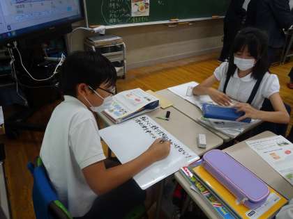 日本の食料自給率の低さ、食生活の変化によって変化してきた輸入の内訳、日本の食料確保に向けた安全性など、栄養教諭がT2に入って学習を進めました。