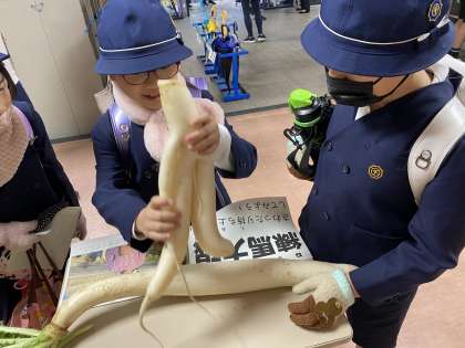 子供たちは、1メートル以上もある練馬大根に大興奮で、背比べをしたり、持ち上げてその重さに驚いたりしていました。