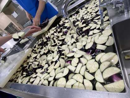 今日のマーボーには、今が旬の秋ナスが入っています。みずみずしい夏のなすに比べ、身がしまっているのが特徴です。