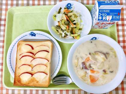 今日ははちみつバターをぬった食パンにスライスしたりんごを並べ、グラニュー糖をふりかけて焼き上げました。調理員さんの知り合いのパティシエから、りんごをきれいに並べたほうがいいとアドバイスをいただき、今日は枚数を揃えてきれいに並べてみました。