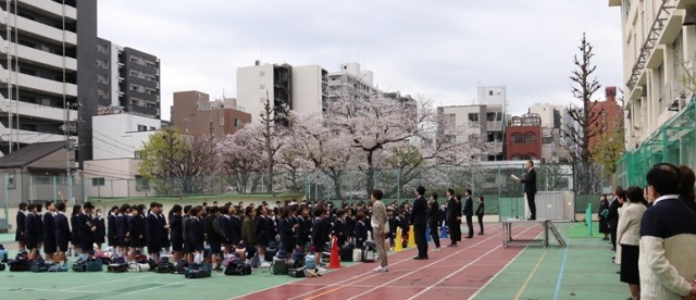始めに校庭に新2年生以上が整列し、着任式を行いました。千束小学校に異動してきた教職員を紹介し、一人ずつ挨拶しました。