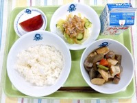 ~今日の給食~○里芋入りきのこご飯○めかぶ入り和風あんかけ卵焼き○キャベツのみそ...
