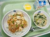 〜今日の給食〜 ○鶏ひき肉のマーボー丼 ○にらたま汁 ○ヨーグルトかんオレンジソ...