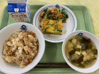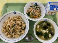 【今日の献立】・牛乳・大豆入りツナご飯・五色卵焼き・生姜和え・すまし汁