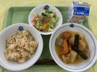 【今日の献立】・牛乳・わかめごはん・鶏肉のレモン焼き・ごま和え・けんちん汁