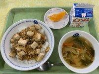 【今日の献立】・麻婆丼・五目スープ・果物(紅まどんな)