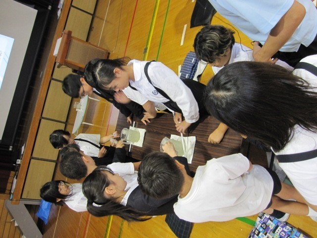水道水ができるまでの話を聞き、浄水場で行われている沈殿実験を行いました。