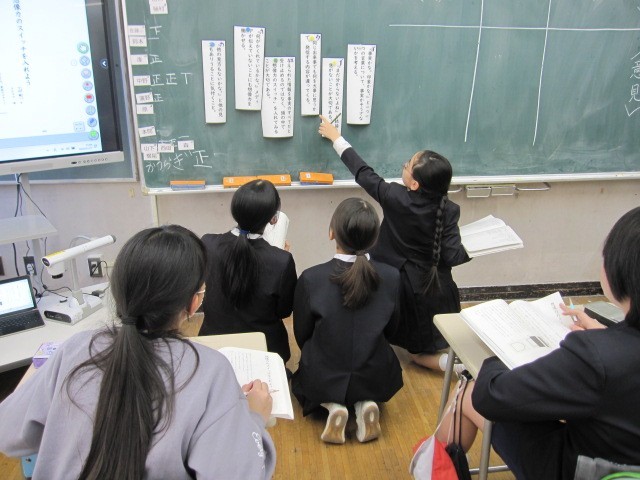 黒板に貼られたセンテンスカードを使って事例と意見を結びつける時間には、カードのそばまで行って友達と話し合ったり、教科書から見付けてノートに整理したり、1人1台端末を活用したりしながら考えたりする姿が見られました。