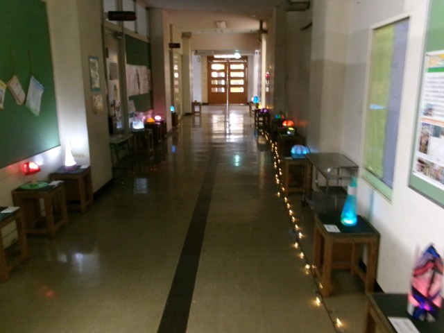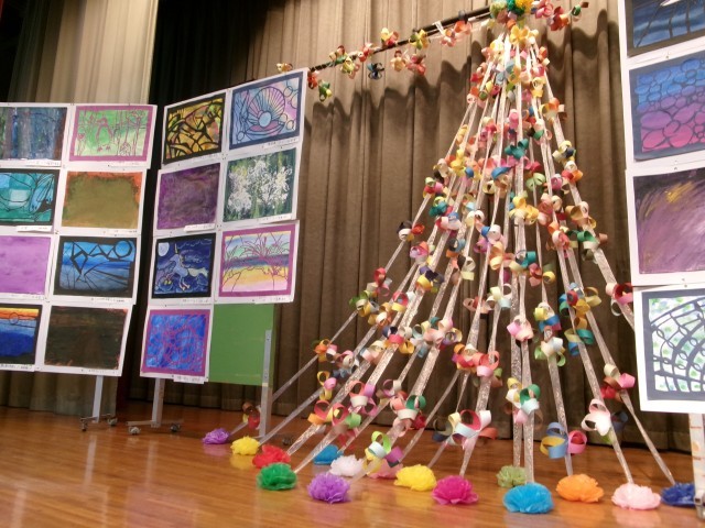 6年生はくらやみで光るランタン、教員を含めた全学年で似顔絵又は自分の名前をデザインアートした降り注ぐ花びらに見立てた