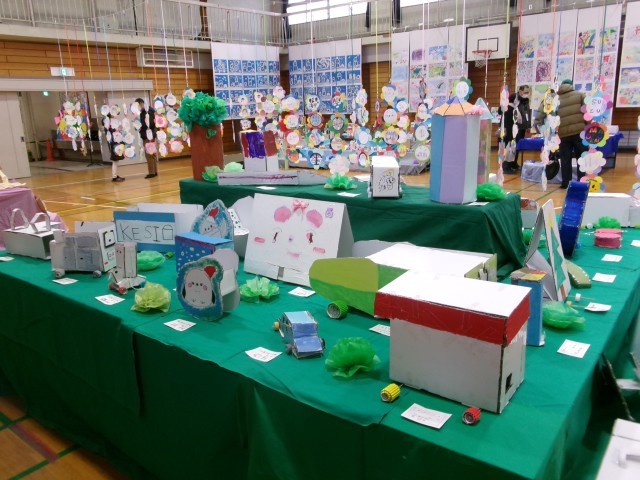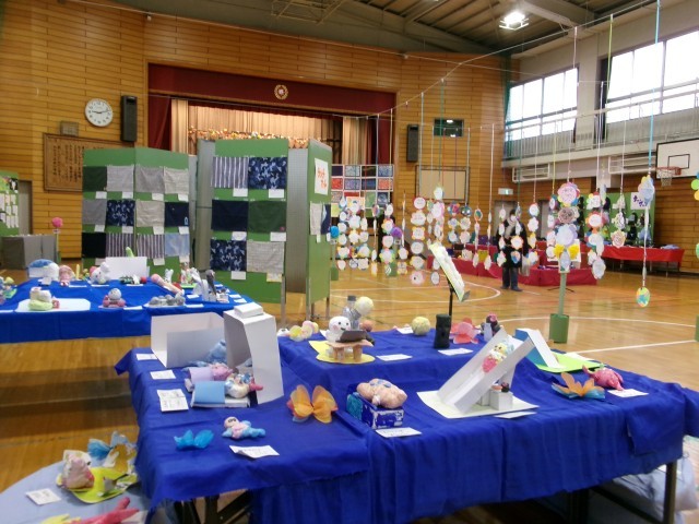 各学年の革細工や平面作品、立体作品と高学年は家庭科で作成したナップザックとランチマットの展示がありました。