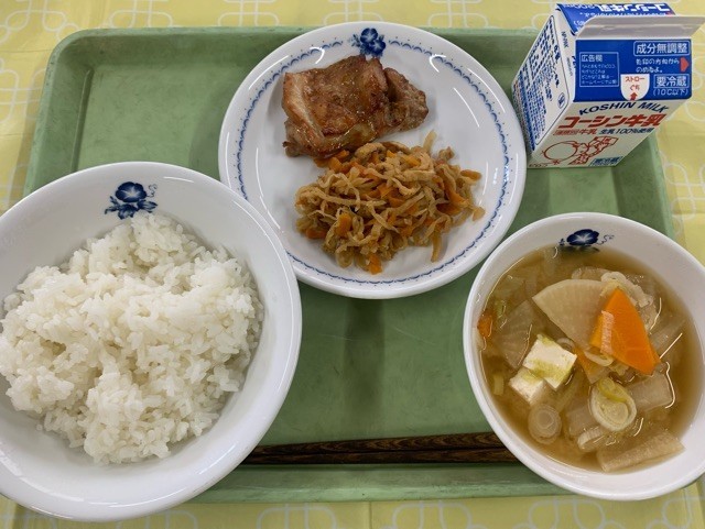 【今日の献立】・牛乳・ごはん・鶏肉のくわ焼き・切り干し大根の煮物・五目みそ汁