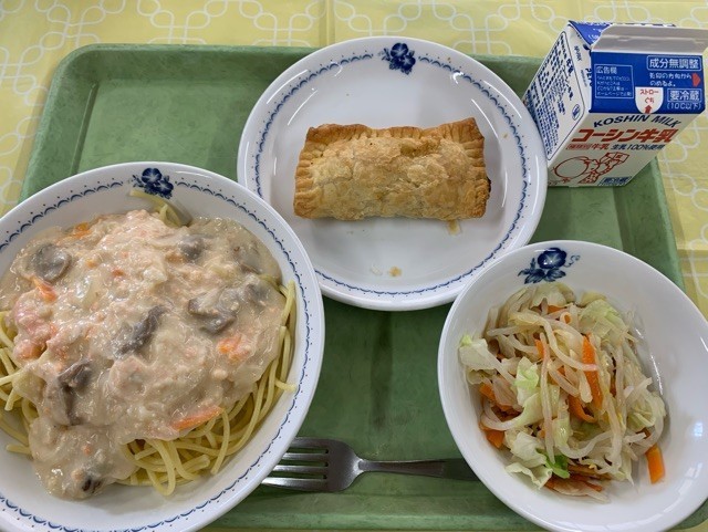 【今日の献立】・牛乳・鮭のクリームスパゲティ・野菜サラダ・かぼちゃパイ