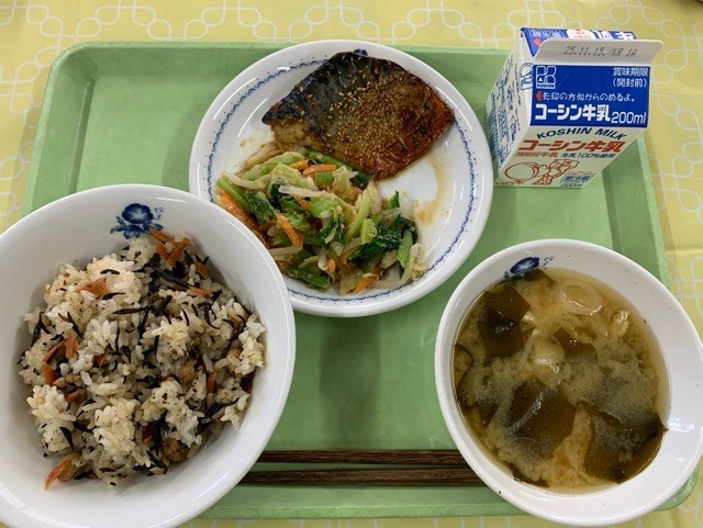 【今日の献立】・牛乳・ひじきごはん・魚のピリ辛焼き・ごま和え・みそ汁