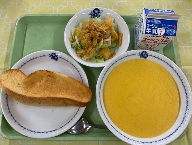 【今日の献立】・牛乳・トースト・シーザーサラダ・キャロットポタージュ