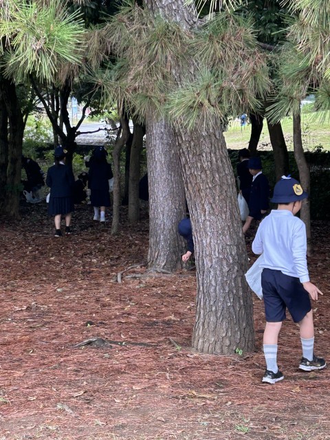 子供たちは、一生懸命どんぐりや松ぼっくり等お宝を探しています。