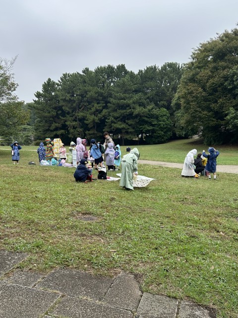 雨が降ってきたので、バスに移動します。残念ですが、バスの中でのお弁当になりました。どんぐりや松ぼっくりは拾えました。