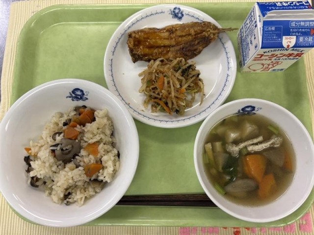 4年生のみなさんは、国語の時間に「ごんぎつね」のお話を勉強していますね。今日は、そのお話に出てくる食べものにちなんだ特別な給食を用意しました。「ごん」が兵十のためにとってきたいわしや、山で見つけたきのこが、今日の給食にも入っています。どこに入っているか、見つけてみましょう!また、「油あげ」のことを「きつね」とよぶことがあるので、今日の汁ものの名前は「きつね汁」です!お話の世界を思い出しながら、今日の給食をよくかんで、おいしくいただきましょう♪