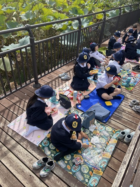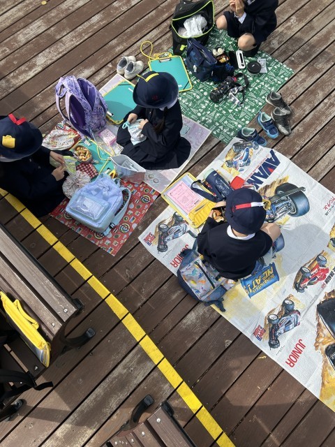 お家の人が用意してくださったお弁当を食べています。日が出てきてポカポカです。朝早くからお弁当の準備ありがとうございました。