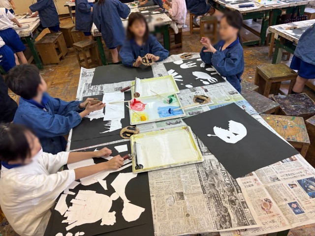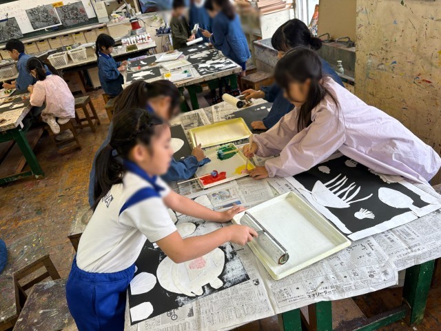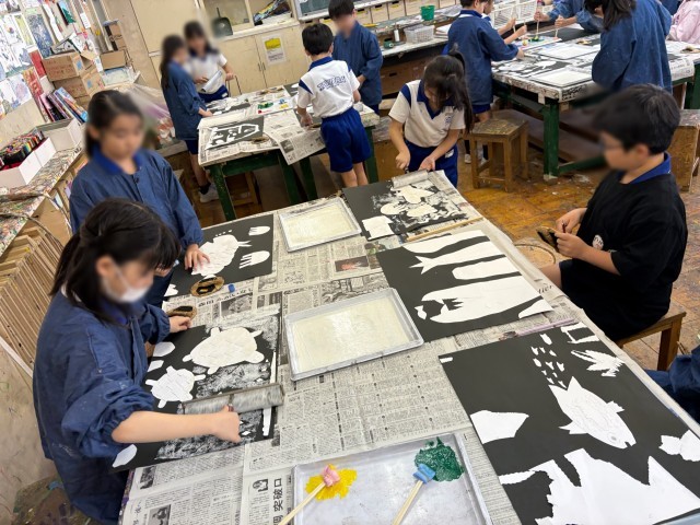 3年生の図工「深海ギョッ!」の紙版画の刷りの様子です。
